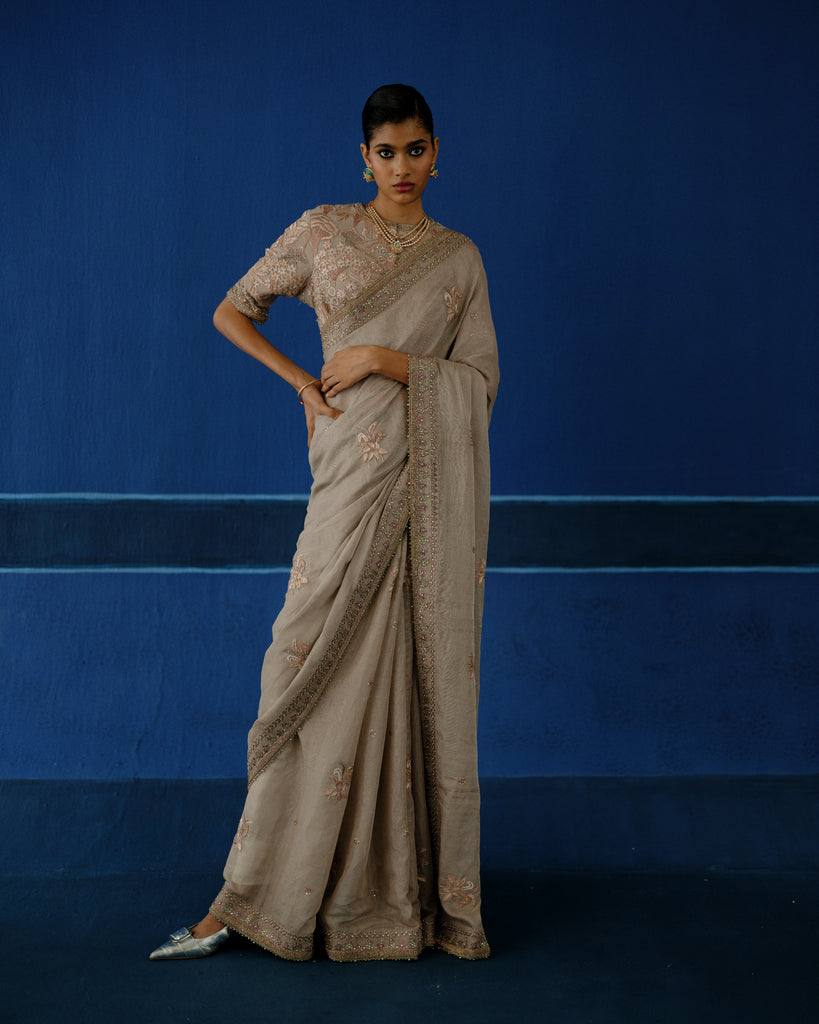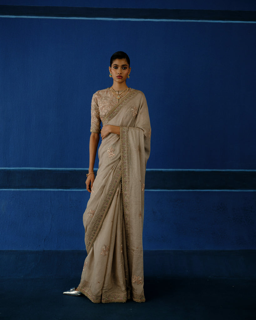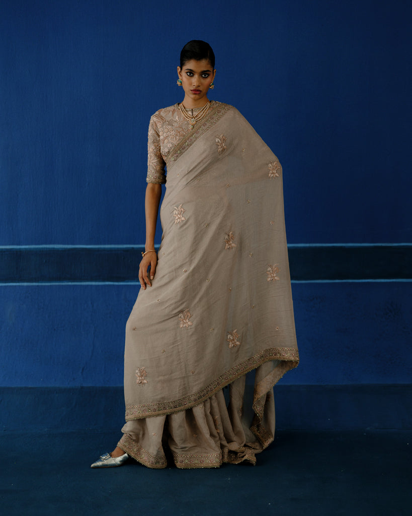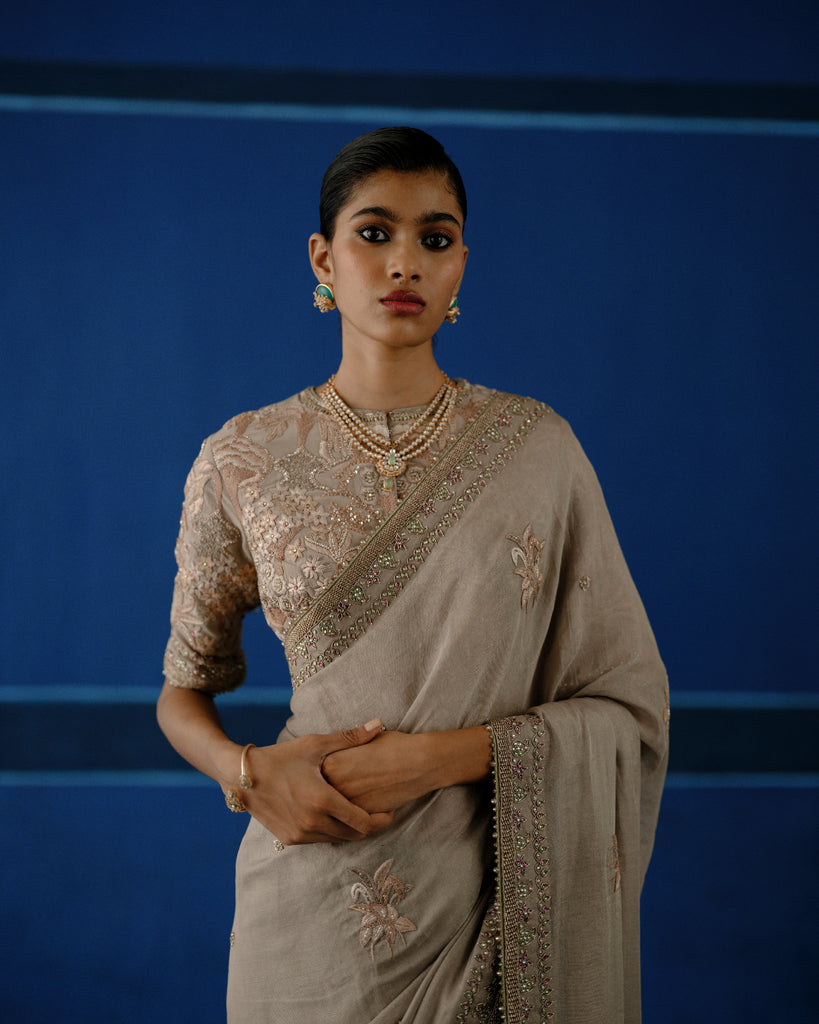 Hand embroidered resham on tissue silk, with calibrated metalic detailing. The blouse features dense, tone-on-tone embroidery, built through layered handworkfor a richy textured finish.