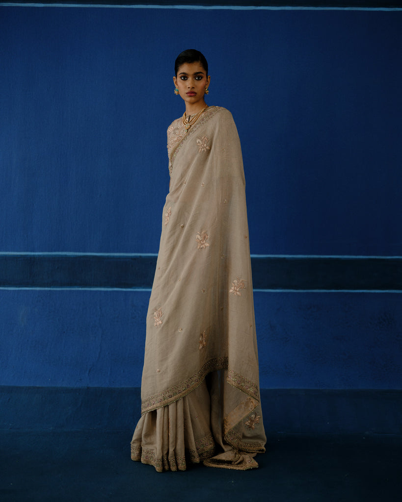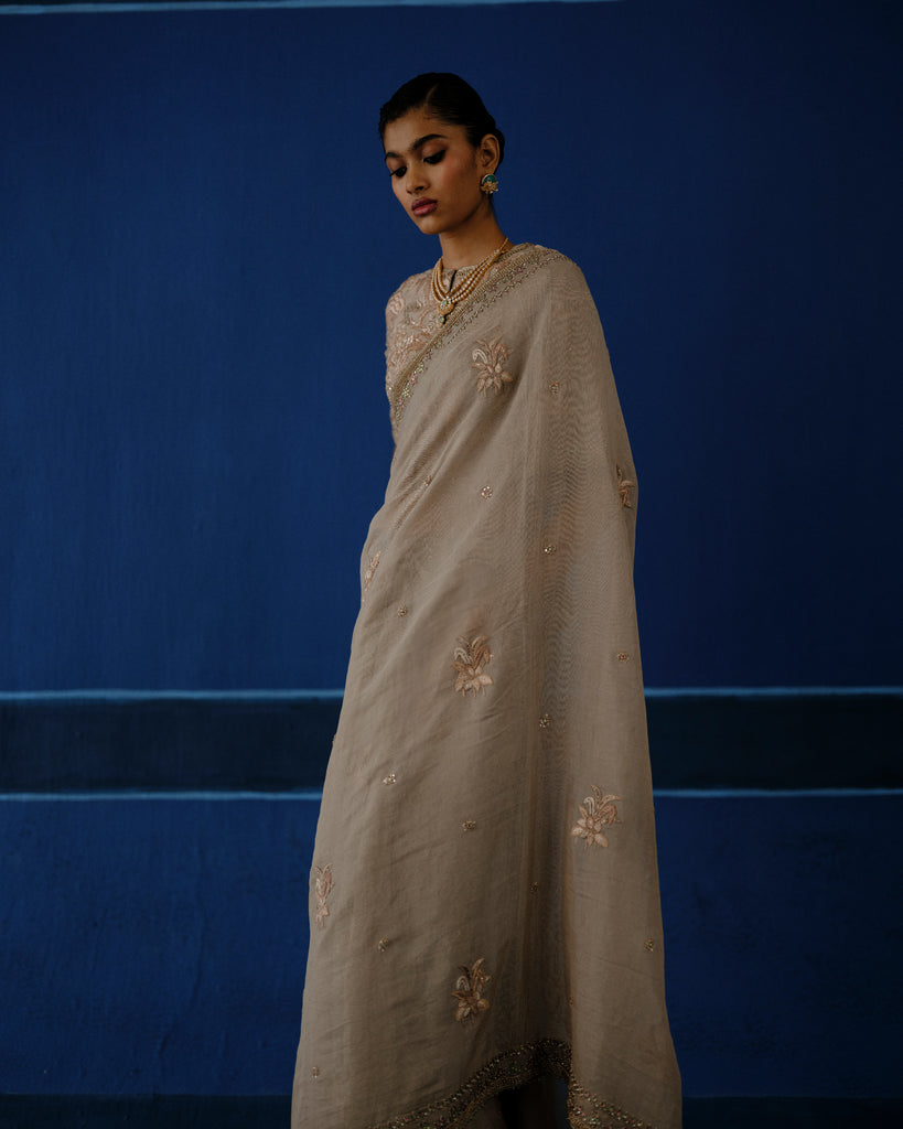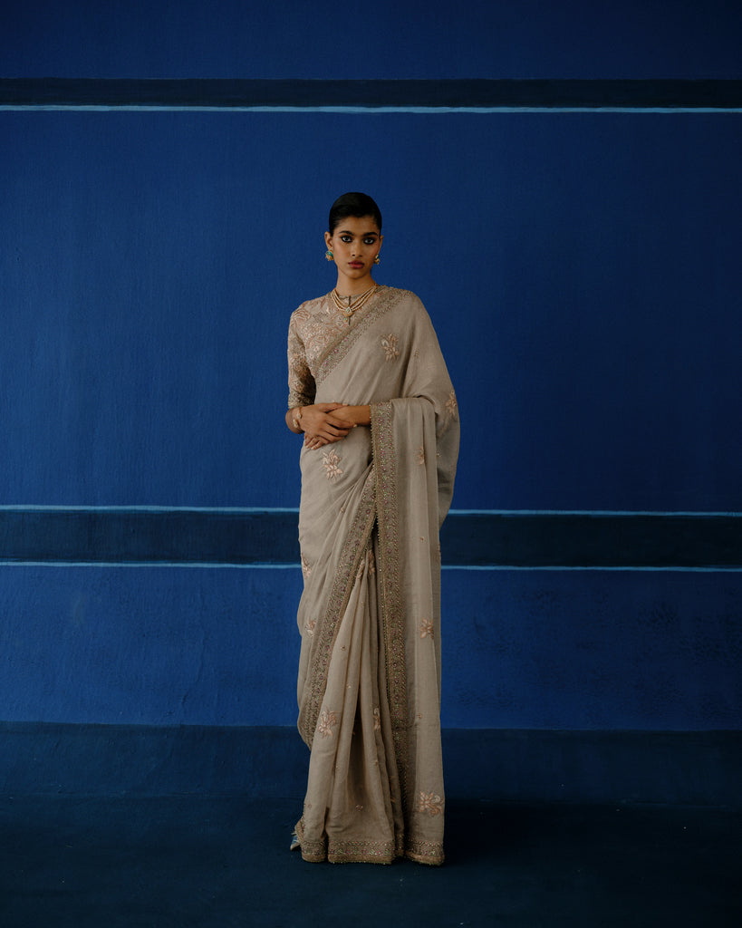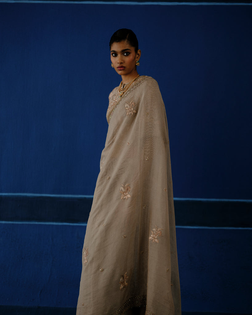 Hand embroidered resham on tissue silk, with calibrated metalic detailing. The blouse features dense, tone-on-tone embroidery, built through layered handworkfor a richy textured finish.