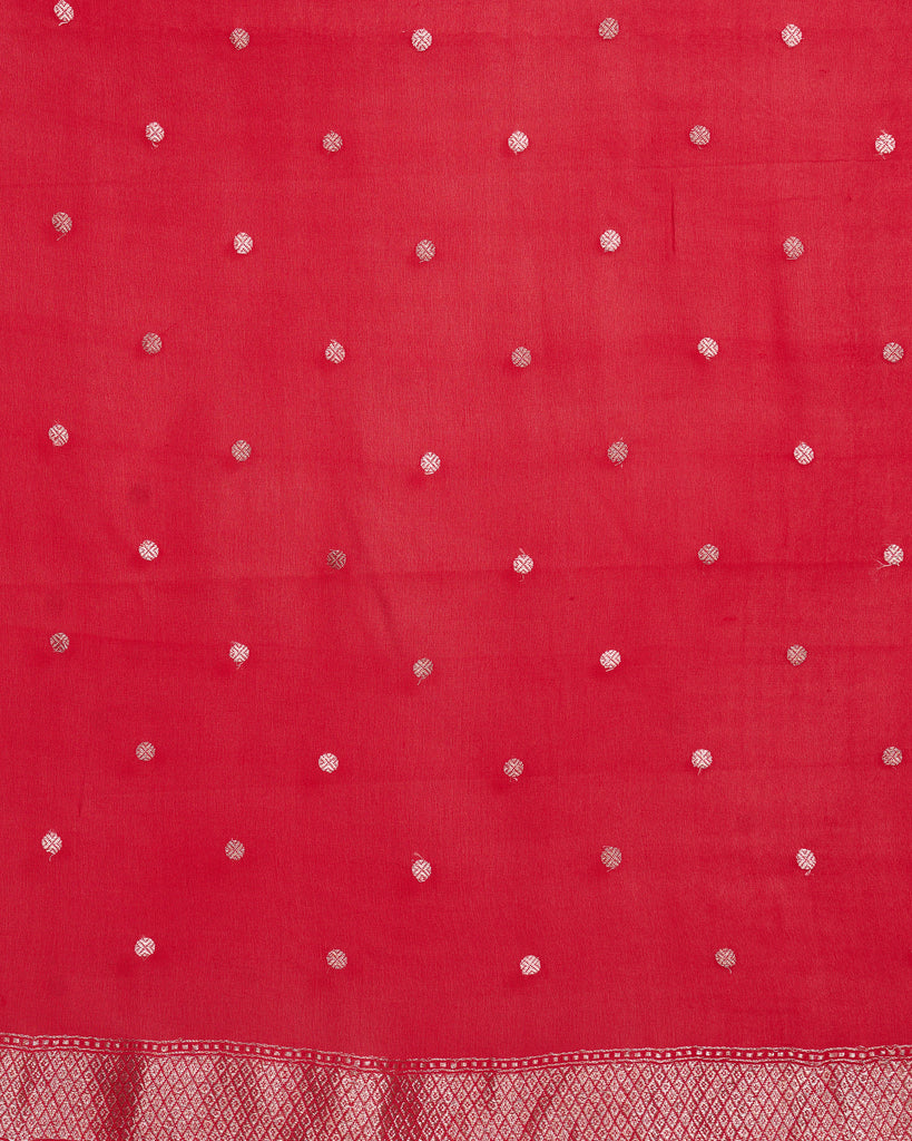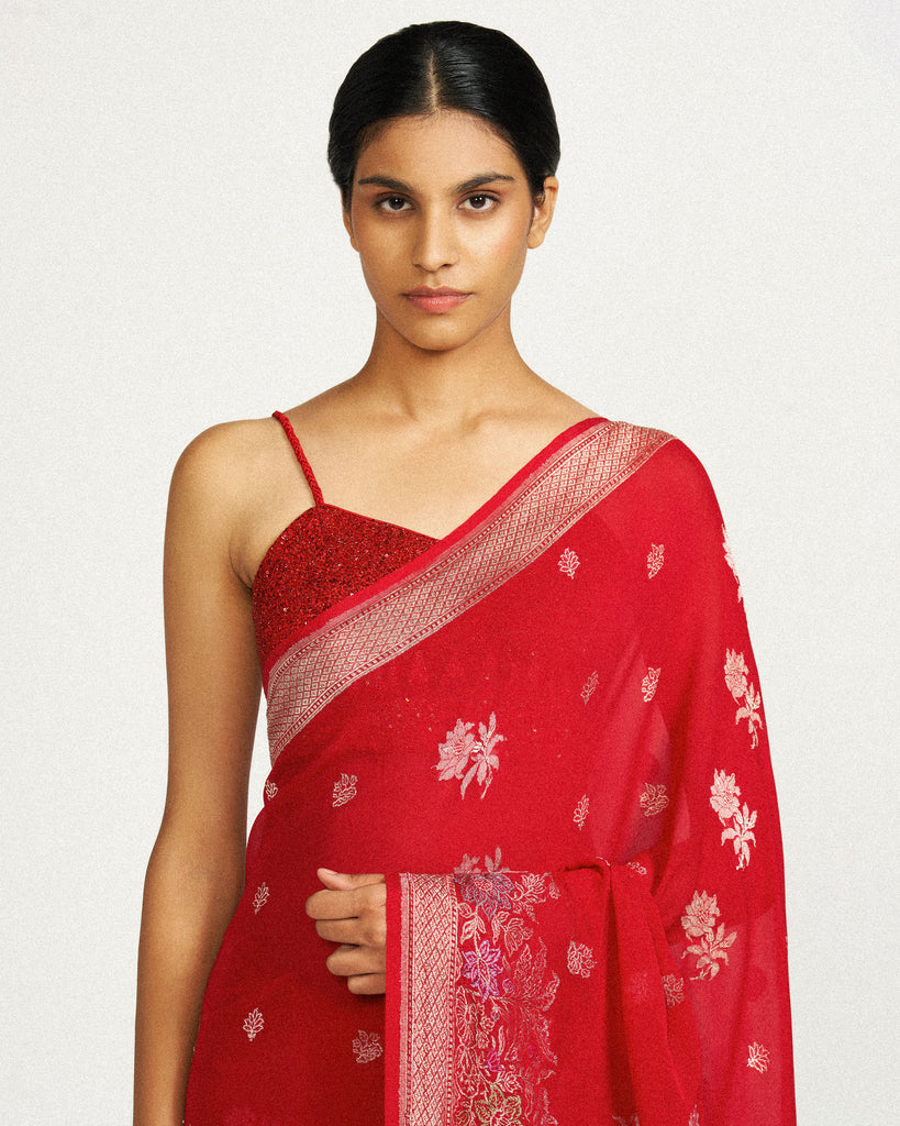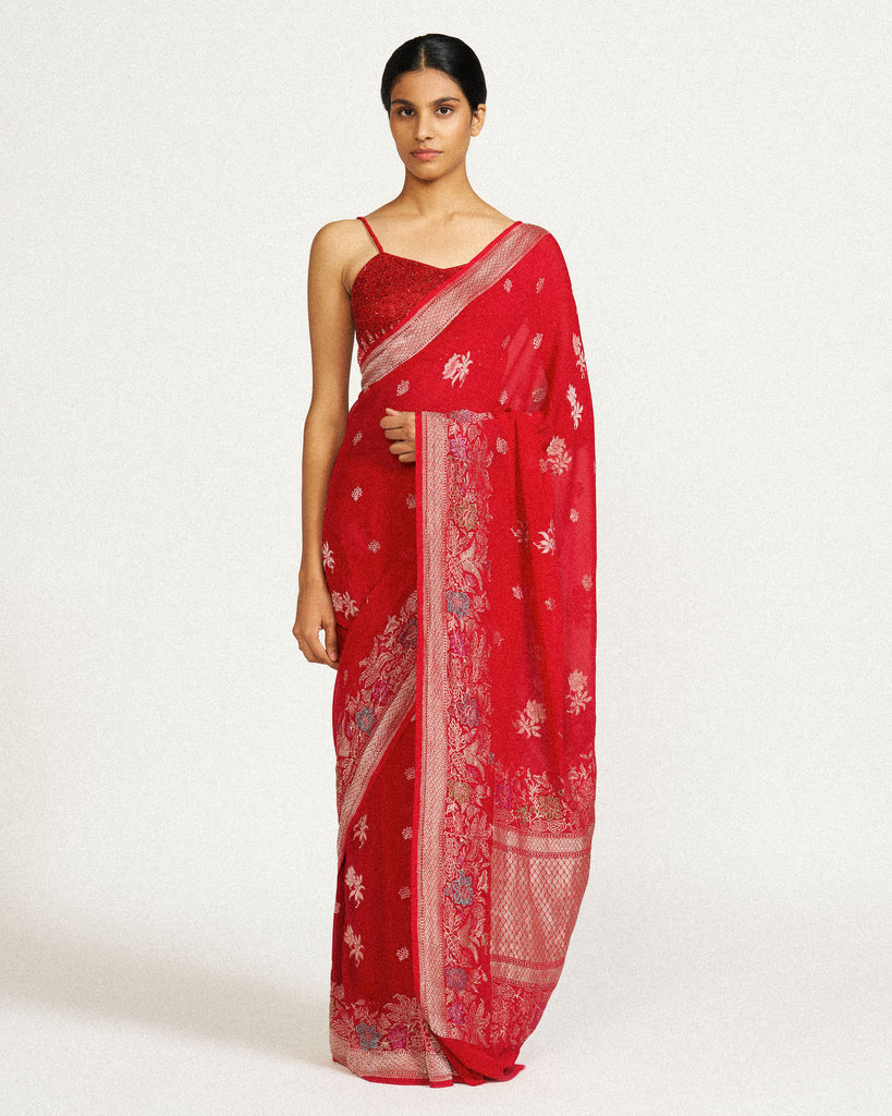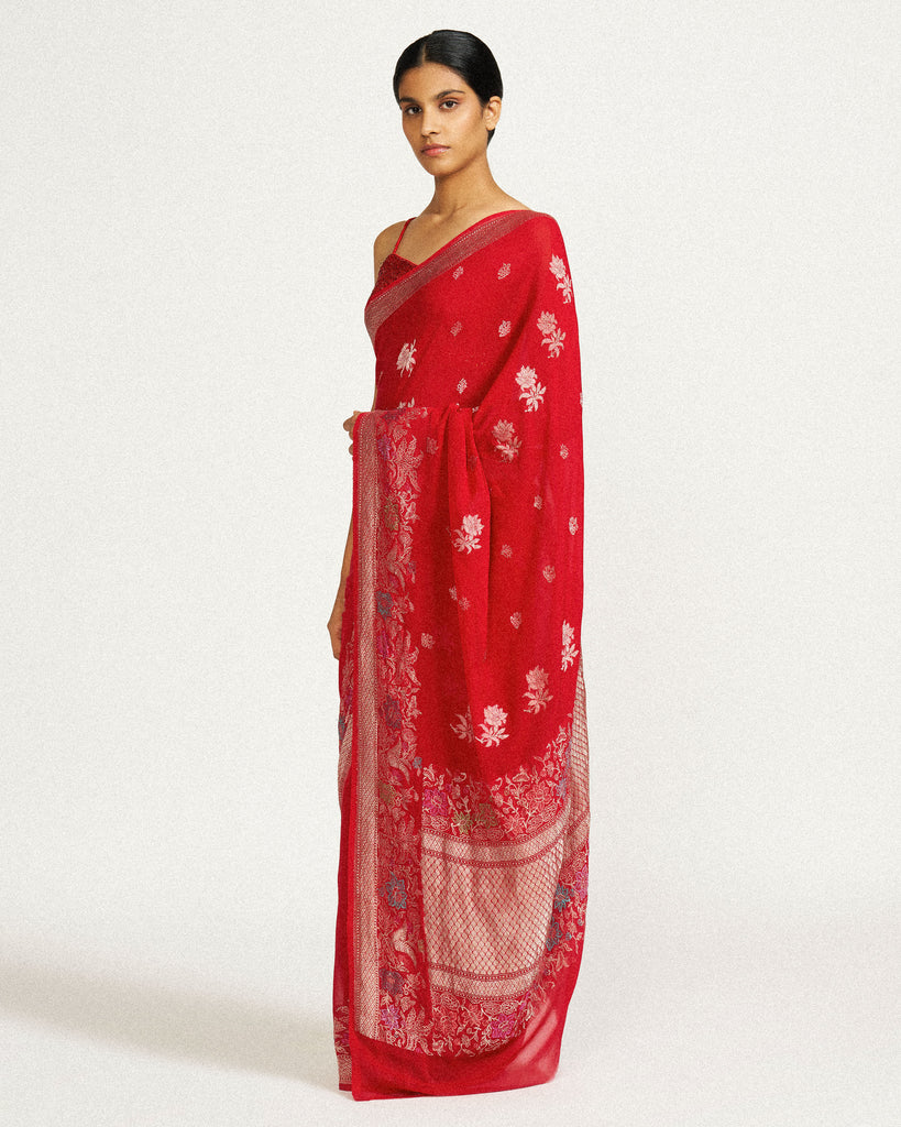 A radiant Chiffon saree in a classic sindoori red, Laal Gulzar features a tapestry of woven silver zari and delicate resham bootis. Floral clusters bloom across the body, while the pallu reveals a richly detailed border, echoing the finesse of traditional meenakari in weave. A timeless celebration of Banarasi artistry in full bloom.