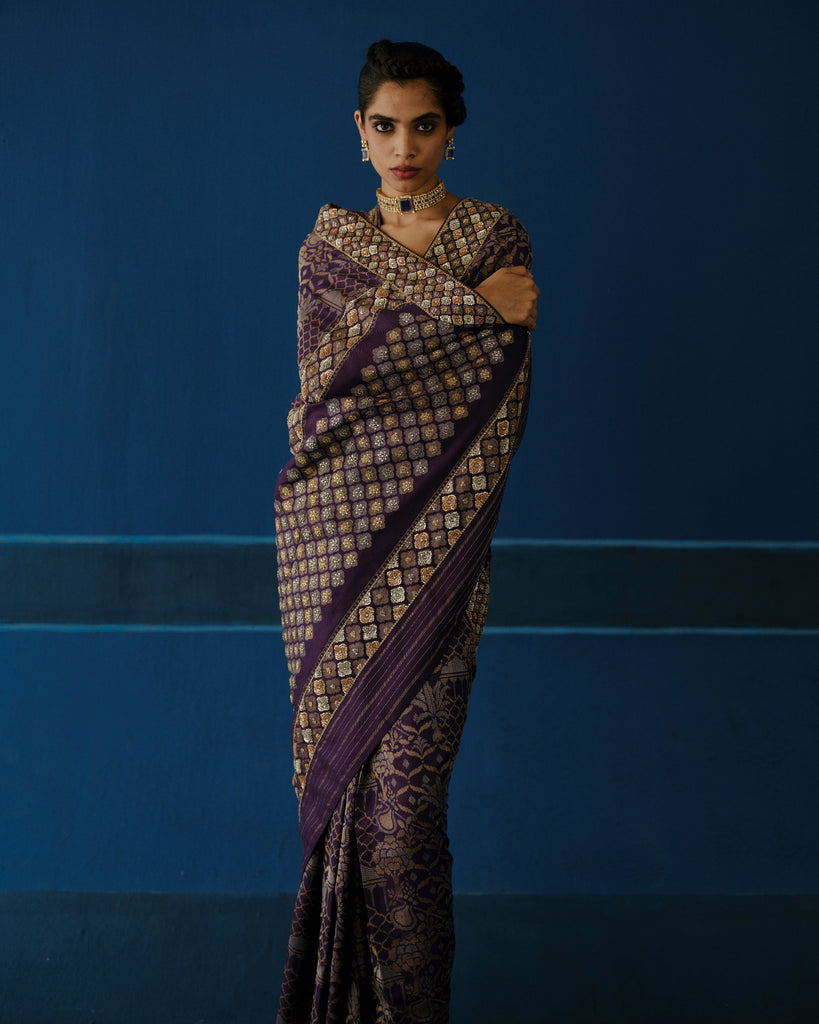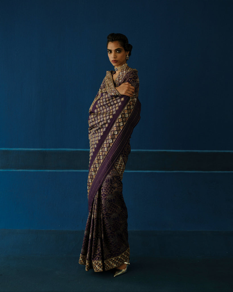 Paired with a velvet blouse, heavily worked in antique-gold zardozi, creating a dense, sculpted contrast.