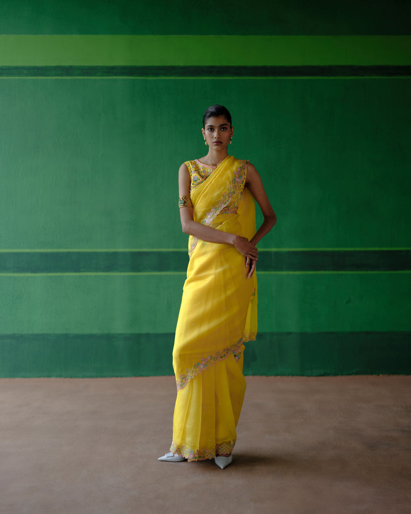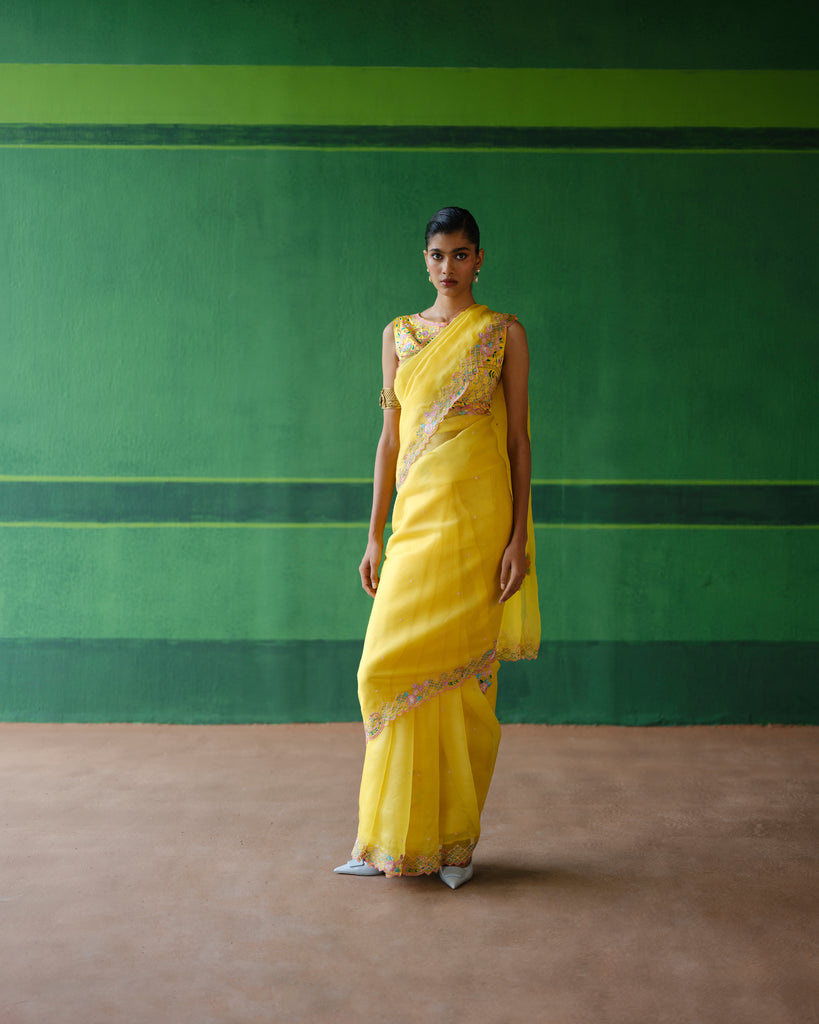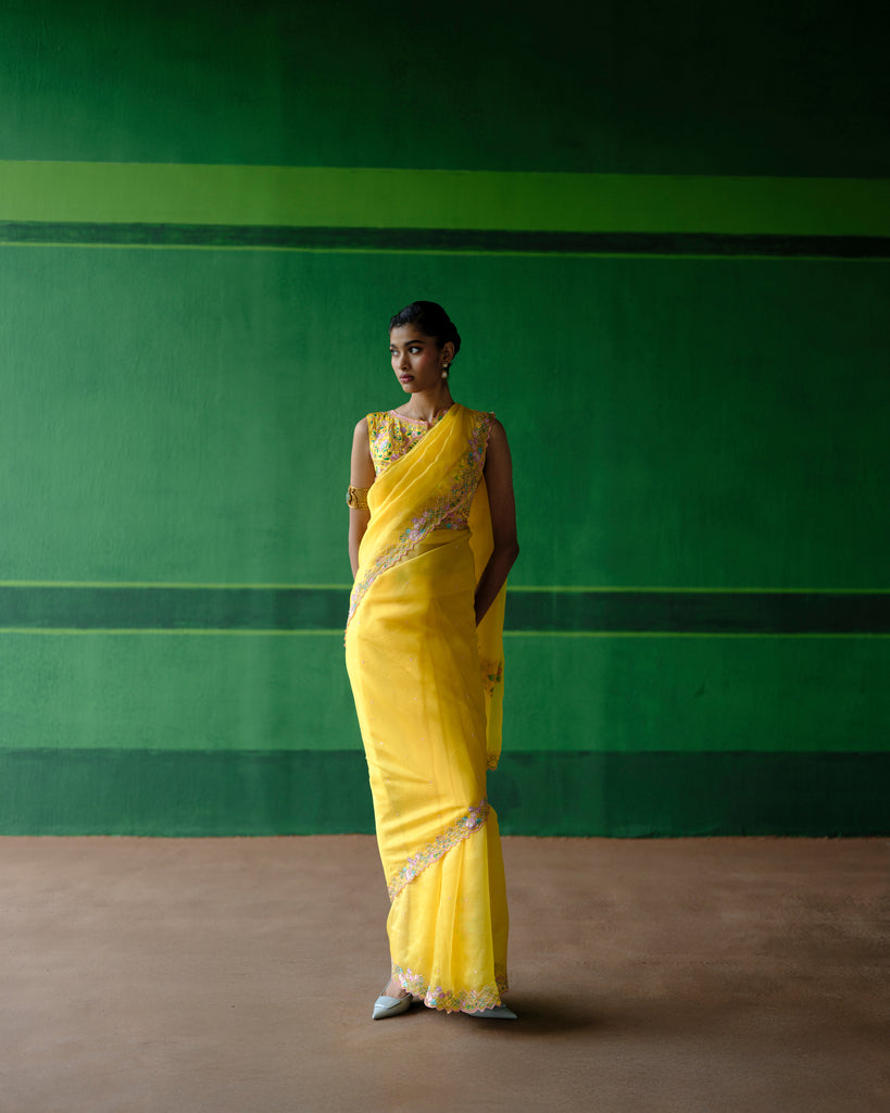 Handcrafted in pure organza, 'Amaltas' features a hand-embroidered floral border, detailed in pastel resham threads with zari and sequin highlights that lend it subtle depth and luminosity. Sequins are delicately scattered across the body, adding a soft glimmer to the fabric.