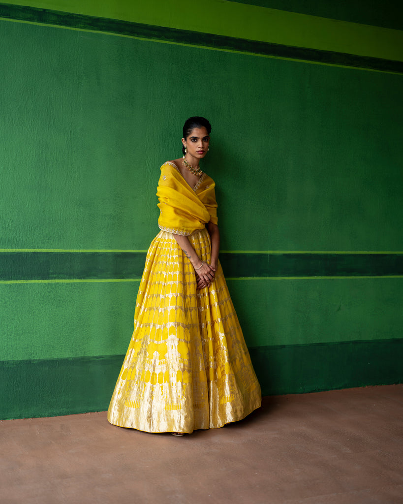 Inspired by the facades of India’s royal architecture, the 'Jharokha Lehenga Set' captures the quiet grandeur of carved archways and sunlit palaces. Crafted in Handwoven katan silk with gold zari, it glows in a burst of fresh marigold yellow. The sheer dupatta made out of pure silk organza, layers over it like a veil of light; crafted with gotta patti work throughout the surface and on the borders. Finished with handmade tassels.