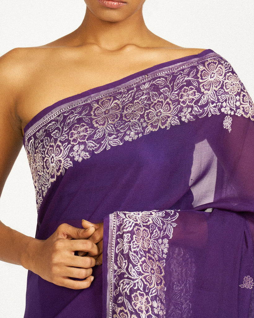 Crafted in flowing crepe, Amara Plum is woven with fine silver zari and tessellated floral patterns that catch the light with every movement. The rich plum hue adds depth and quiet drama, while the border- etched with intricate motifs- grounds the drape in elegance.