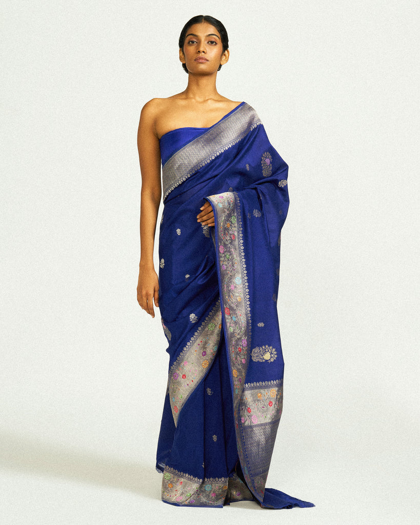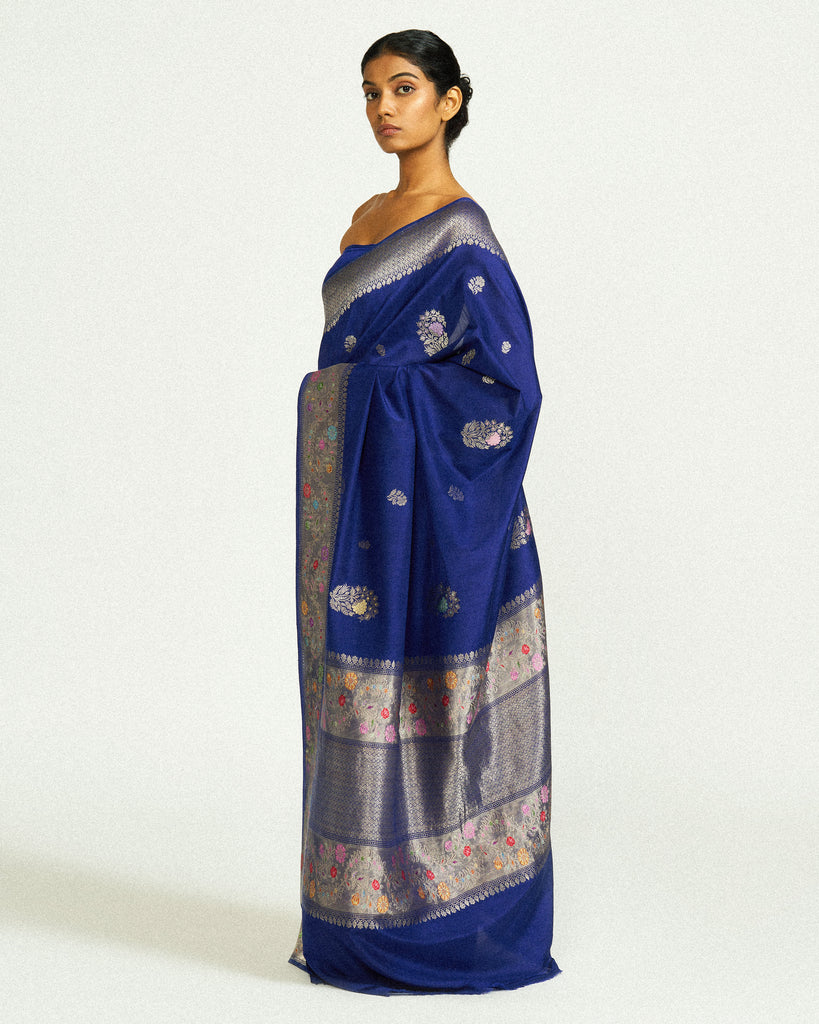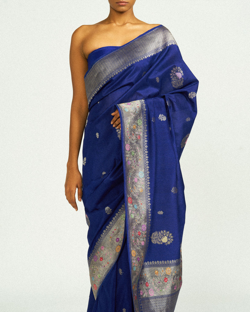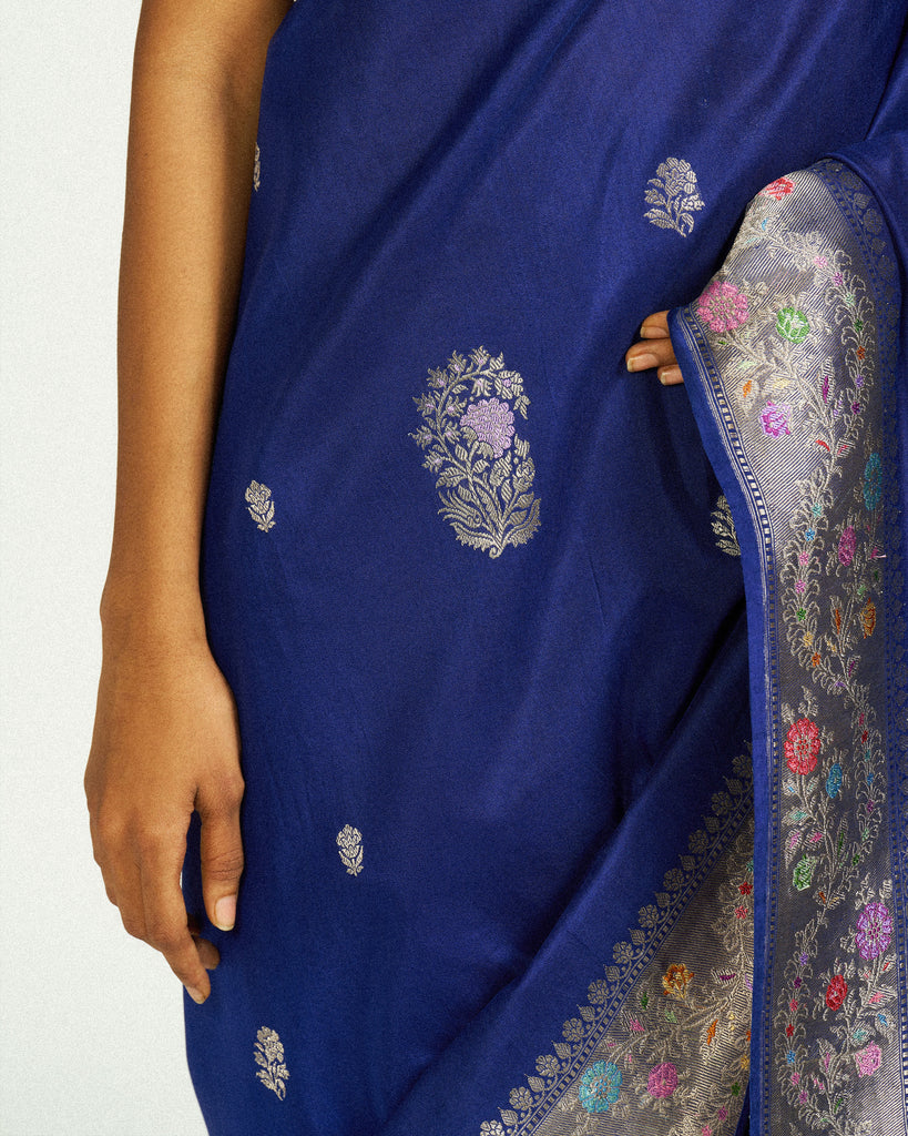 A rich Katan silk canvas in deep blue, handwoven with silver zari and delicate meenakari detailing. The saree features blooming floral bootas scattered across the body, while the border is intricately embellished with pastel-hued blossoms- each one meticulously rendered in meenakari.
