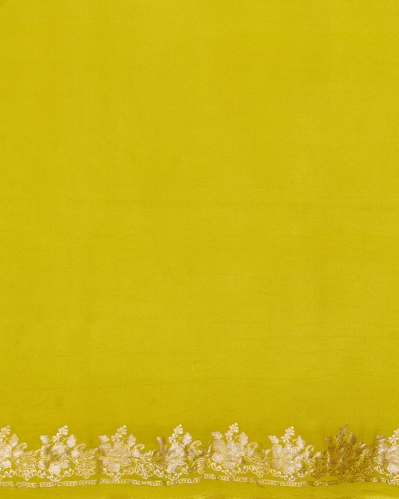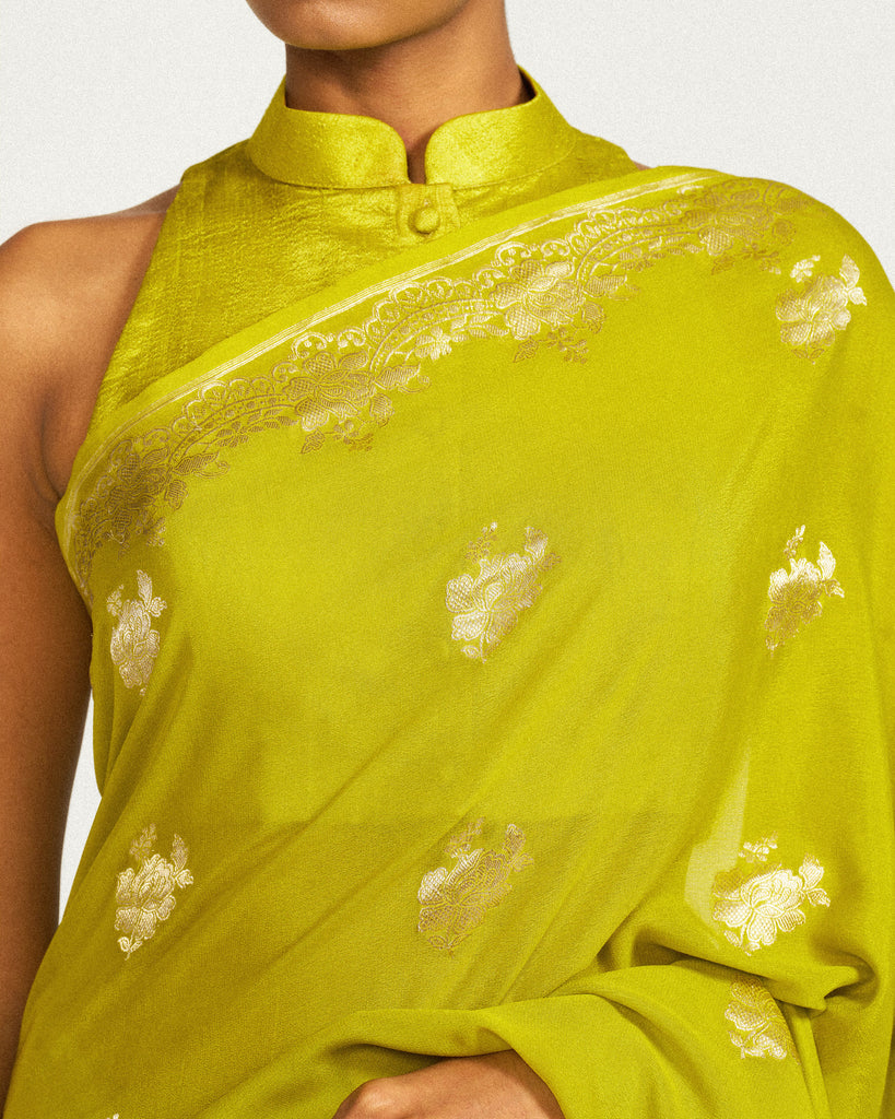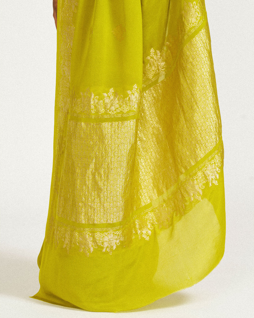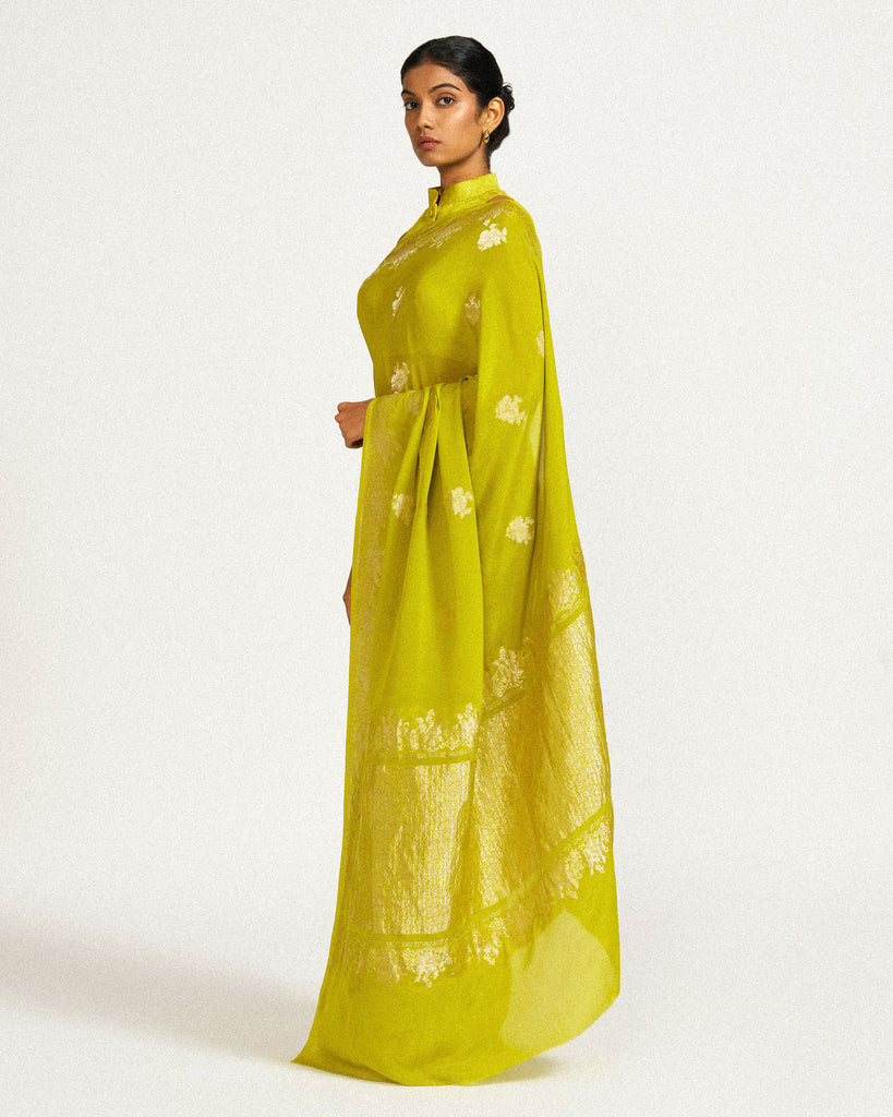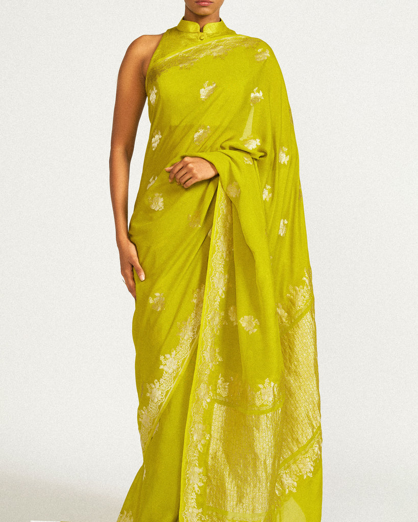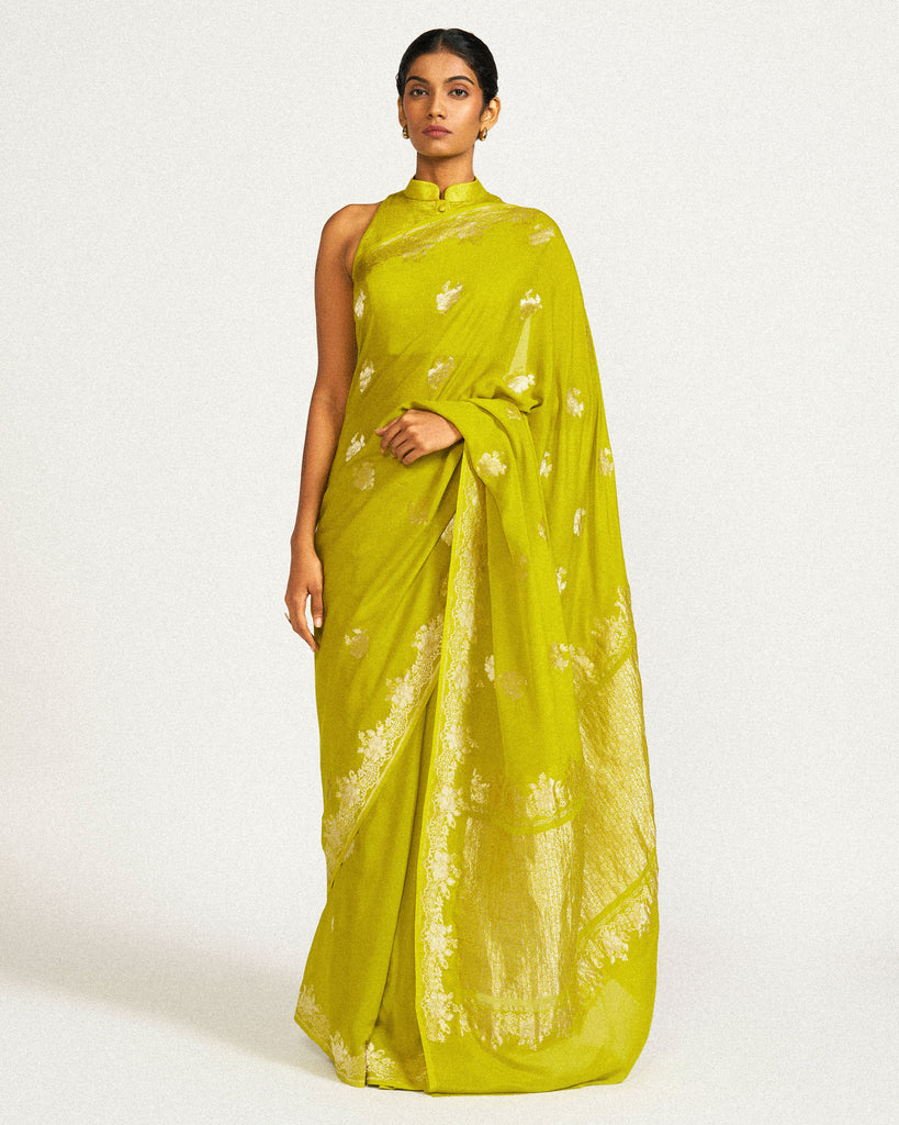 A featherlight crepe saree in a soft, herb-toned green, traced with delicate silver zari and scattered woven florals. The drape carries the ease of summer and the quiet sheen of celebration - made for days that stretch gently into evening.