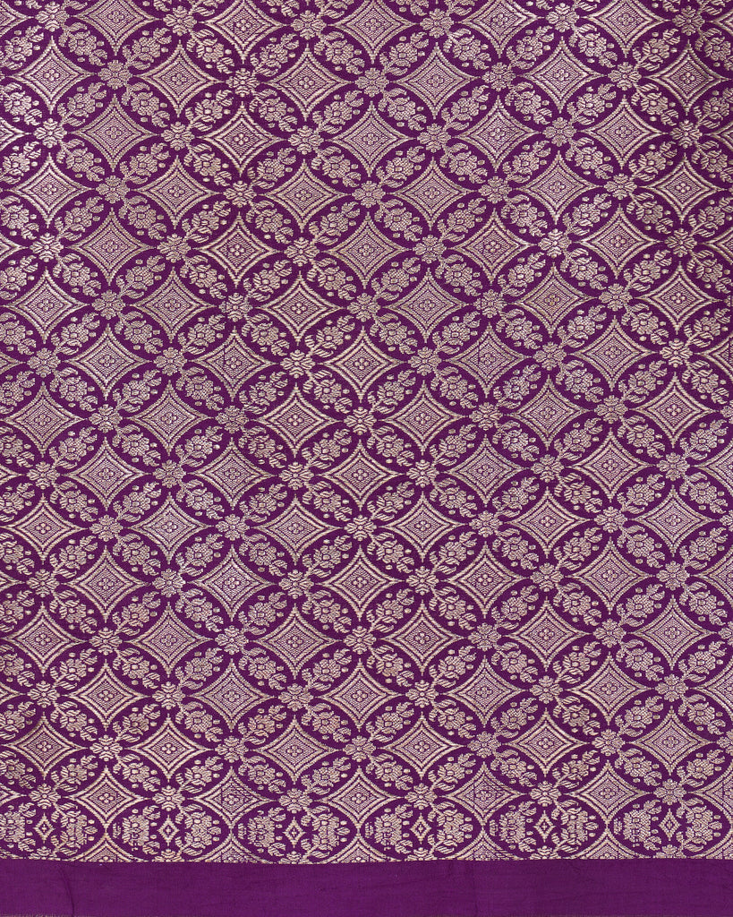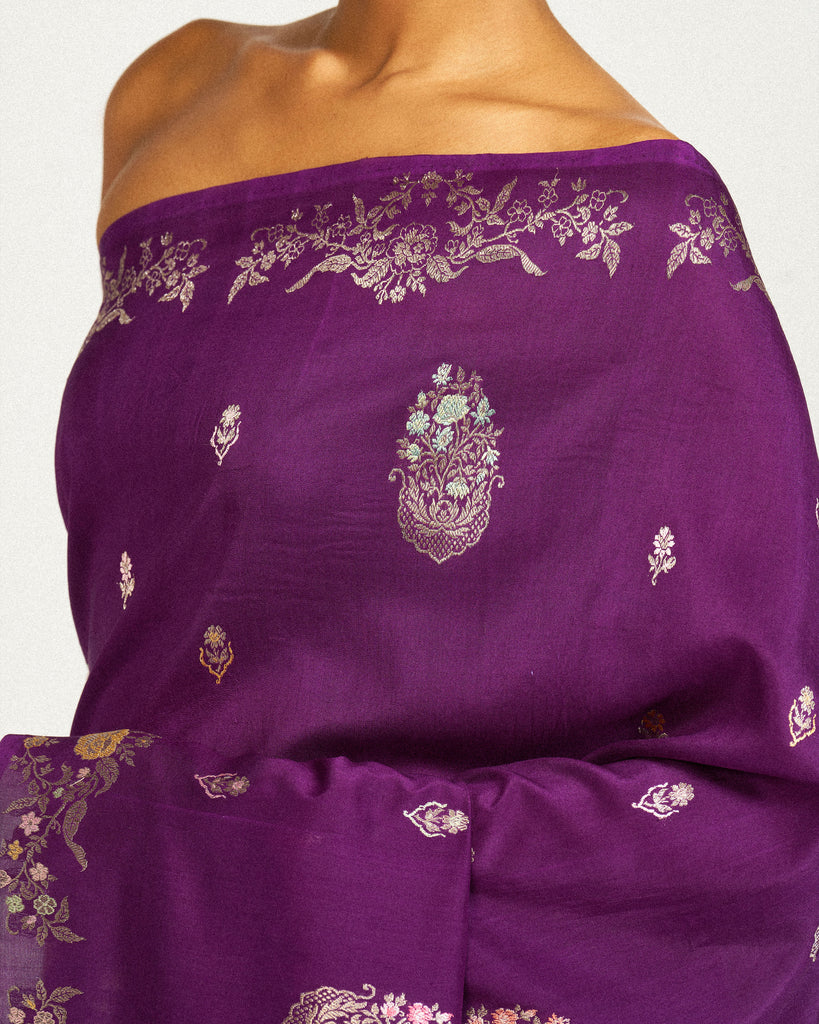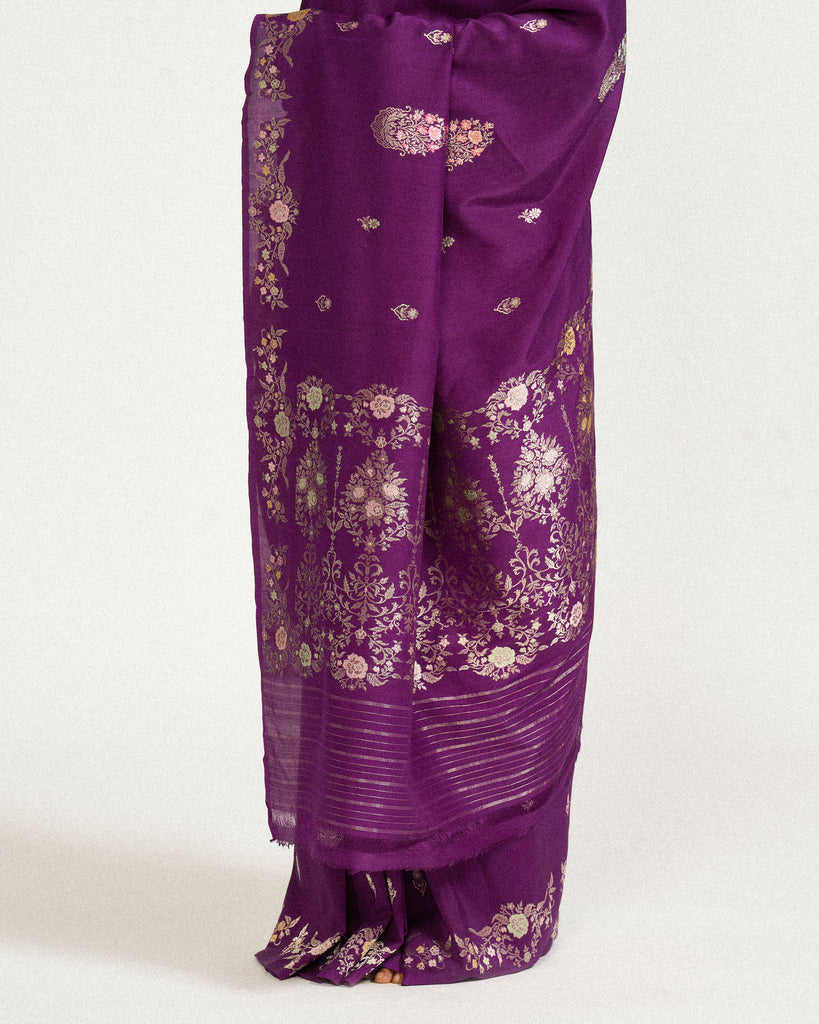Woven in lustrous Katan silk, Jamuni Élise is a rich purple saree adorned with intricately woven floral bootas in silver zari and soft resham. The colour - a deep, velvety plum, holds light with a quiet glow, while the floral motifs bloom across the body with understated opulence.