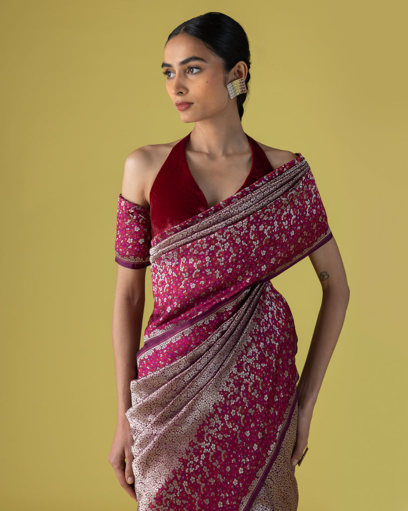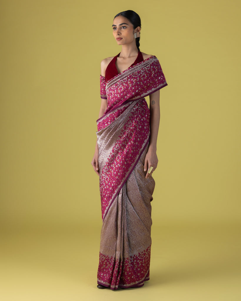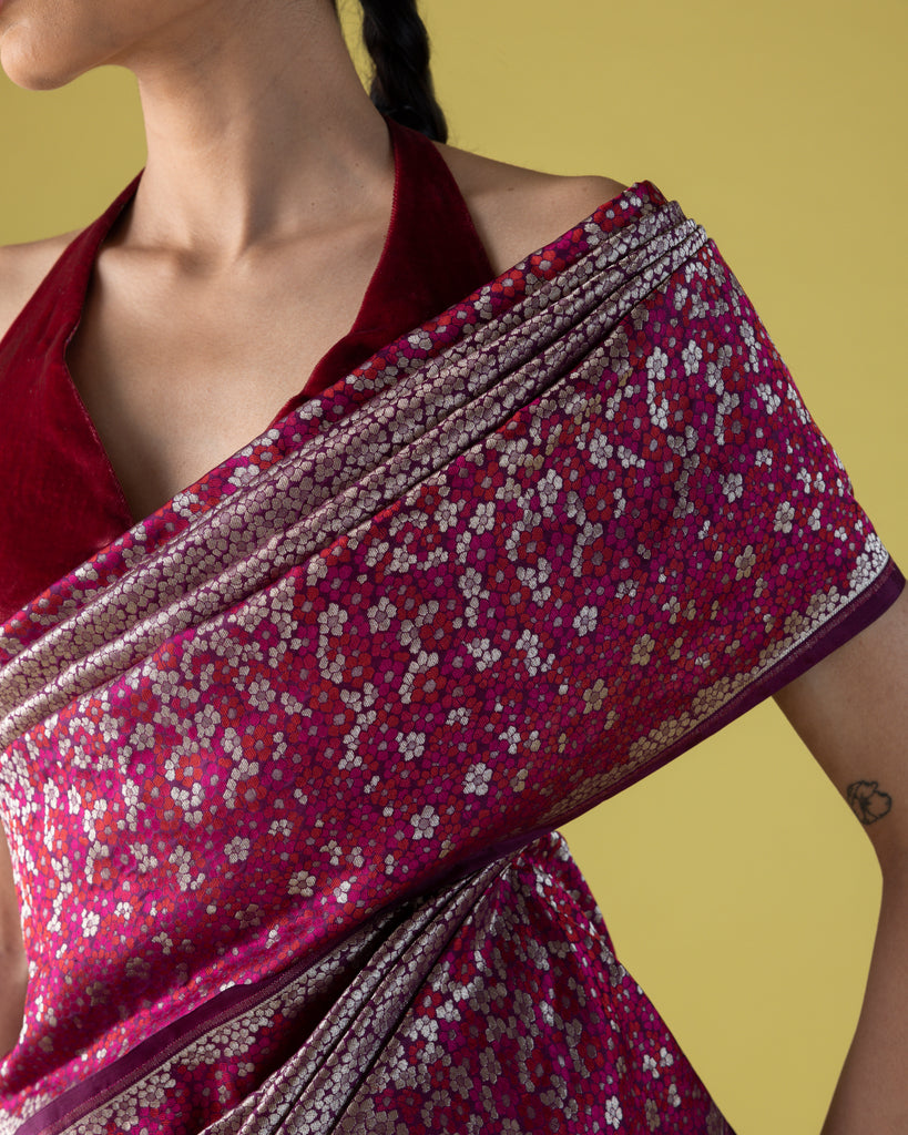 Magenta Antique Gold Diagonal Layout a classic pure silk saree with a subtle shine and smooth finish. The fine patterns add character, while the fabric falls naturally, creating a neat and polished appearance.