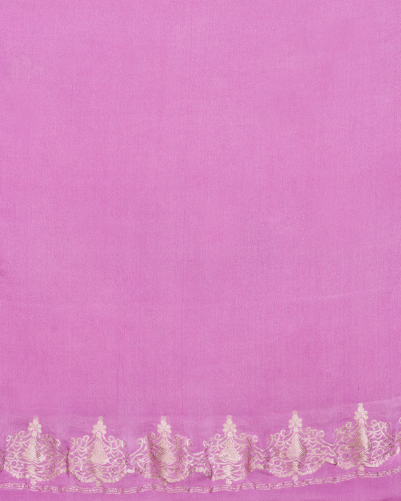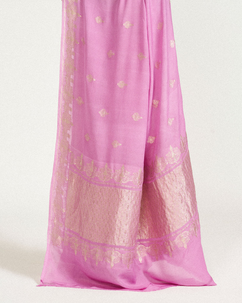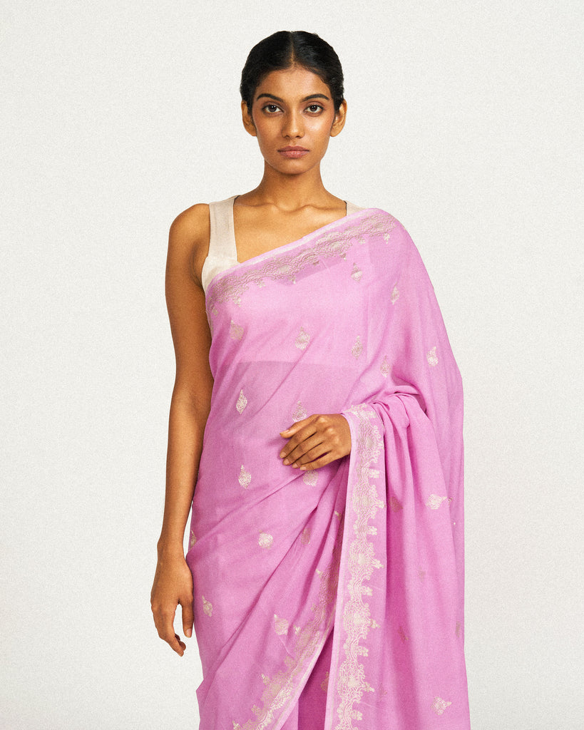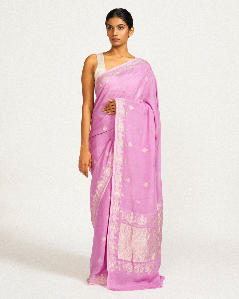 Sugar Lilac is a crepe saree woven in a dreamy lavender-pink tone, scattered with silver zari bootis and framed in a delicate floral border. The softness of the drape meets the shimmer of craft - making it light, luminous, and quietly striking.