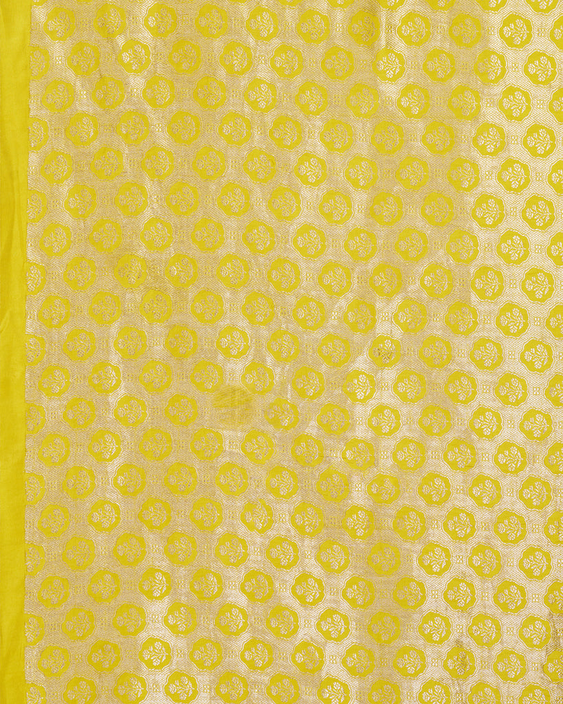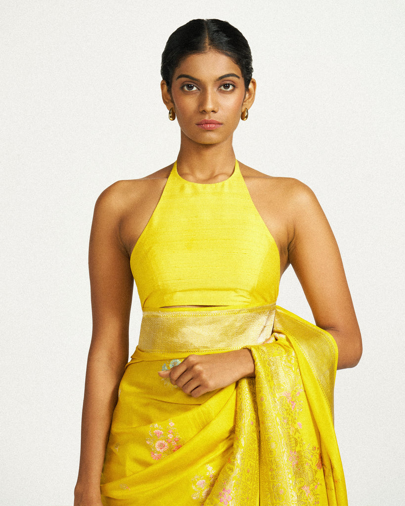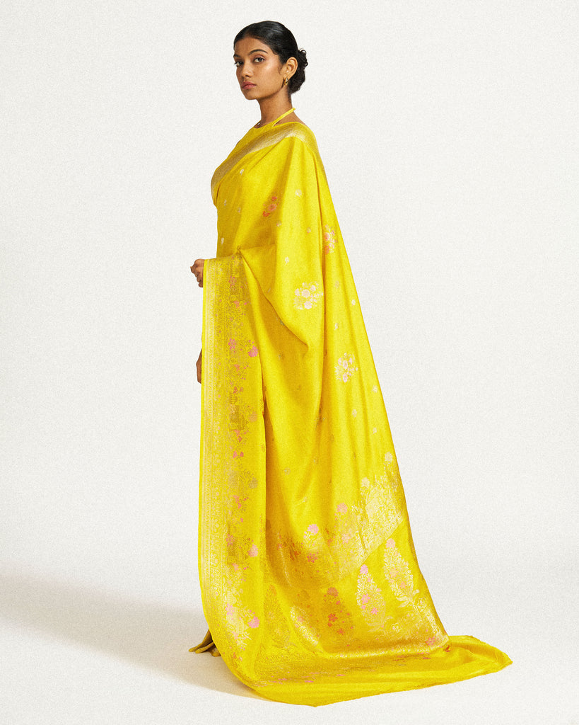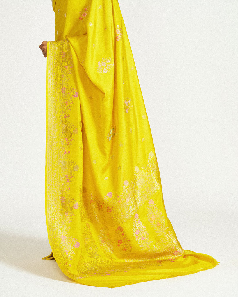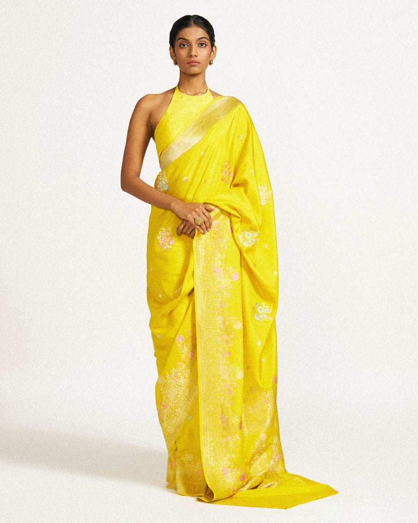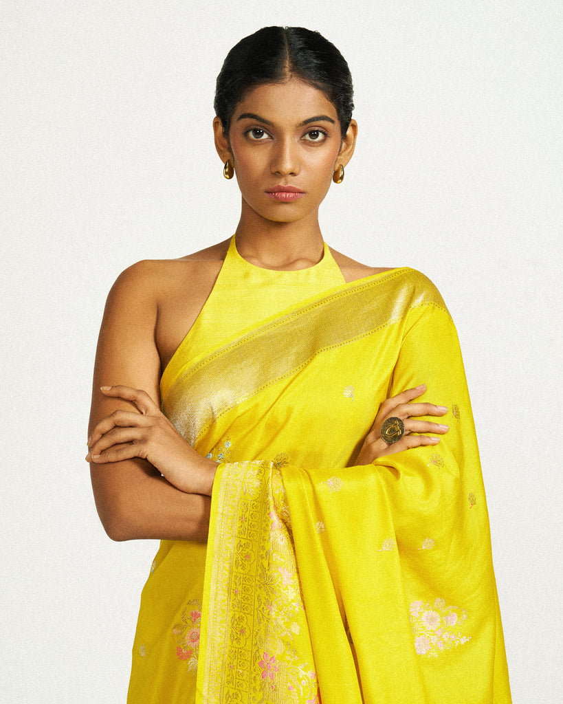 A radiant silk saree in Sunehri Nimbu- a sunlit yellow layered with delicate resham meenakari work in soft pastels, scattered like wildflowers in bloom. Finished with a gentle zari border, the drape is light, fluid, and quietly festive.