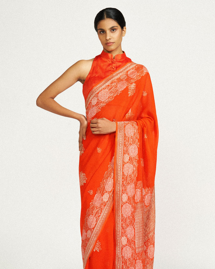 A vibrant crepe saree in a sharp tangerine tone, woven with silver zari florals arranged in a soft tessellated rhythm. Light in weight but rich in detail, it’s a drape that balances festive clarity with a modern graphic edge.