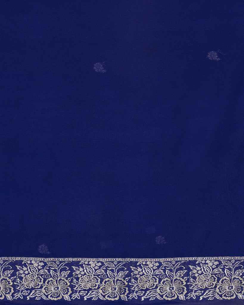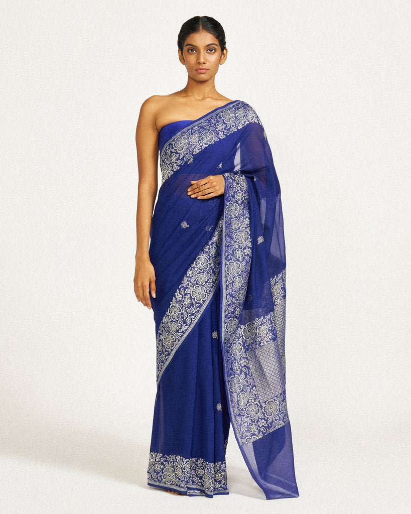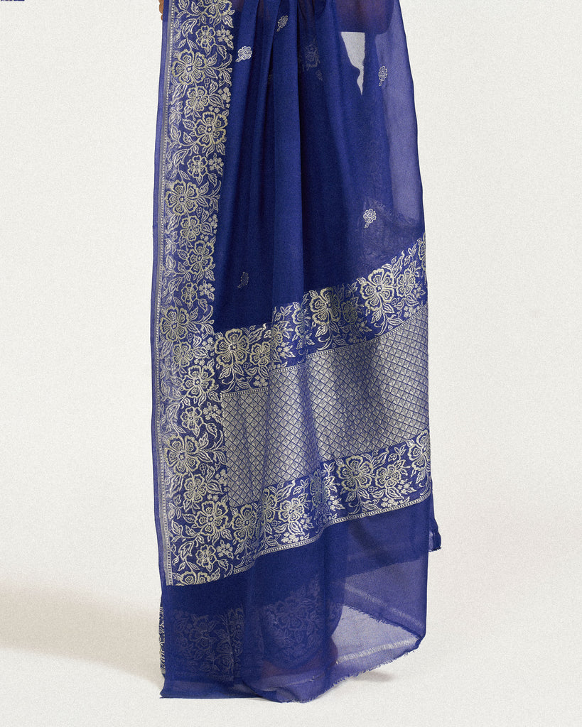 Woven in rich chiffon, Tej Indigo drapes with a soft matte fluidity that moves like ink in water. The deep indigo base is brought to life with silver zari floral tessellations - a dense network of vines and blooms arranged in rhythmic symmetry. The border and pallu are intricately woven, creating contrast through texture and light, rather than excess. This is a saree that celebrates both restraint and radiance - a balance only handwoven textiles can hold.